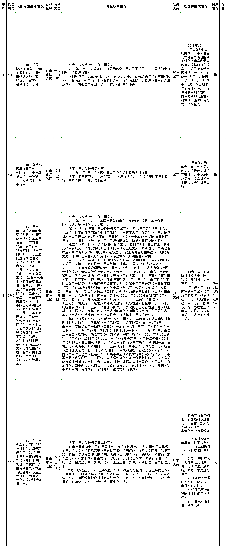 白山市群众信访举报转办和边督边改公开情况一览表(第32批 2018年12月16日)