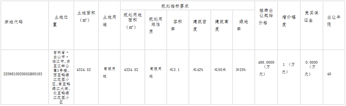 经临江市人民政府批准,临江市自然资源和林业局决定以 挂牌 方式出让 1(幅) 地块的国有土地使用权。现将有关事项公告如下: