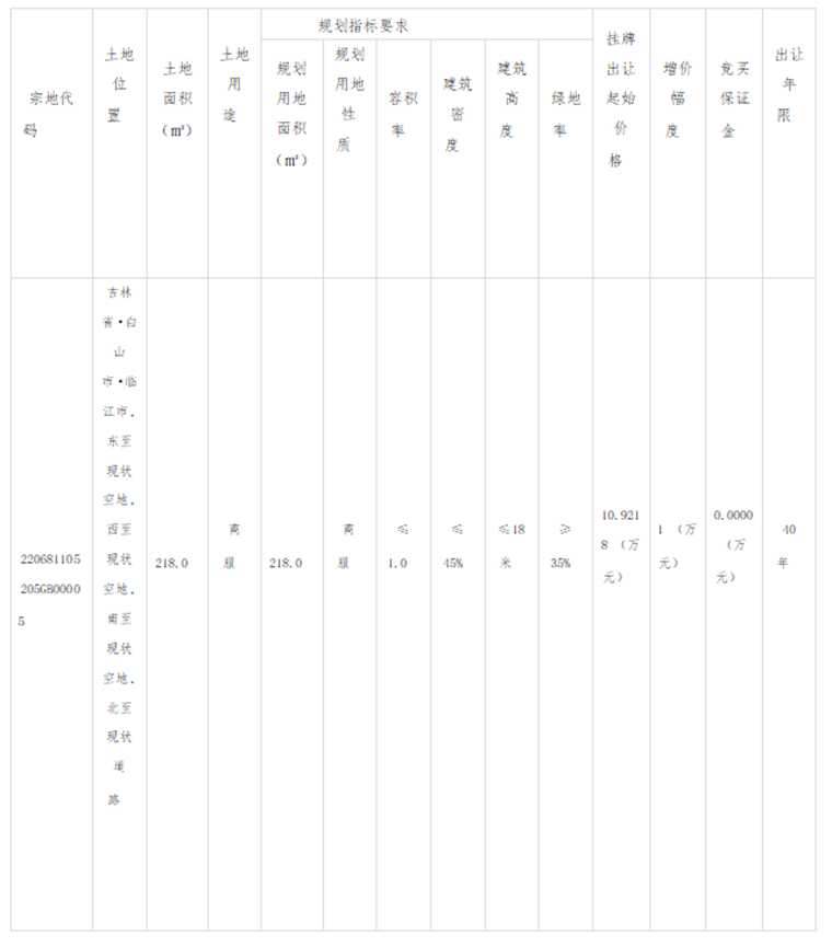 经临江市人民政府批准,临江市自然资源和林业局决定以挂牌方式出让 1(幅) 地块的国有土地使用权。现将有关事项公告如下: