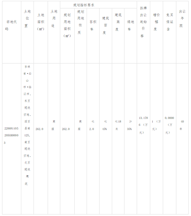 经临江市人民政府批准,临江市自然资源和林业局决定以挂牌方式出让 1(幅) 地块的国有土地使用权。现将有关事项公告如下: