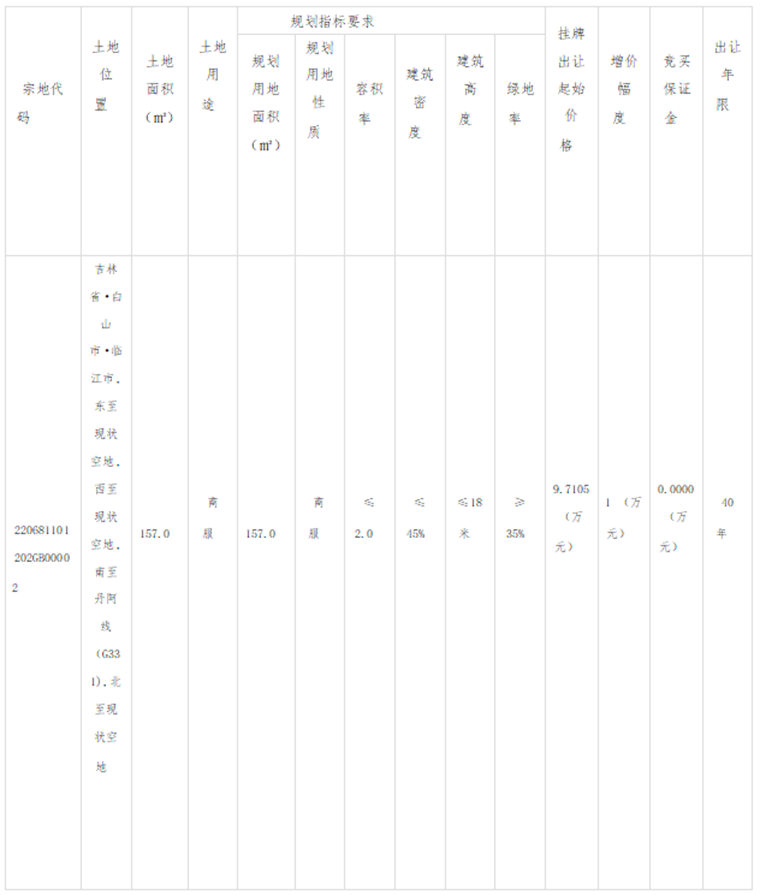 经临江市人民政府批准,临江市自然资源和林业局决定以挂牌方式出让 1(幅) 地块的国有土地使用权。现将有关事项公告如下: