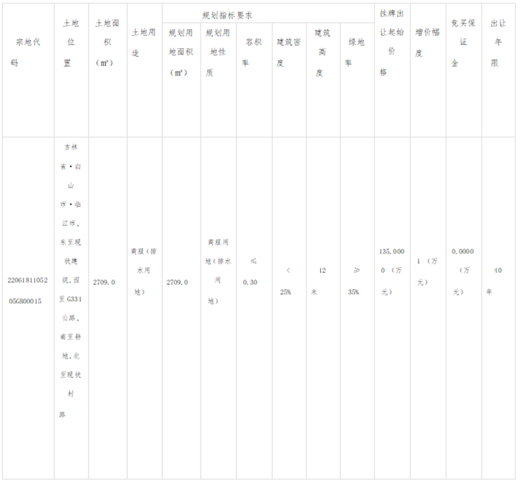 经临江市人民政府批准,临江市自然资源和林业局决定以挂牌方式出让 1(幅) 地块的国有土地使用权。现将有关事项公告如下: