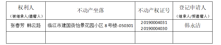 根据《不动产登记暂行条例实施细则》第十四条的规定,经初步查验,我中心拟对下列不动产权利办理不动产继承登记。根据《不动产登记暂行条例实施细则》第十七条的规定,现予以公告。如有异议请自本公告之日起 15 个工作日内,将异议书面材料送达临江市不动产登记中心。逾期无人提出异议或者异议不成立的,我中心将予以登记。