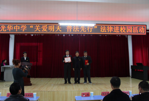 仪式上,光华中学校长韩波为临江市法院刑事庭庭长周立伟和家事法官刘洋两名同志颁发了法制辅导员的聘书,同学们也用自己的方式为两名辅导员的加入表示了热烈欢迎。