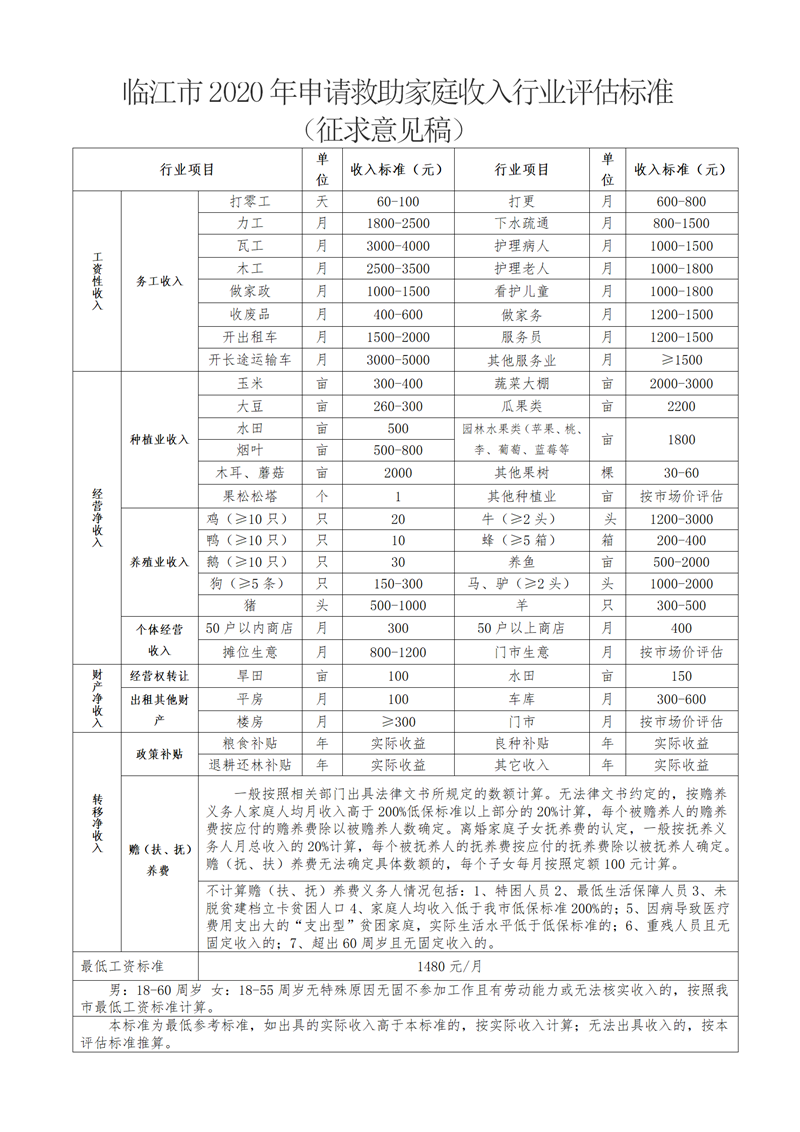 《临江市2020年申请救助家庭行业收入评估标准(征求意见稿)》网上公开征求意见