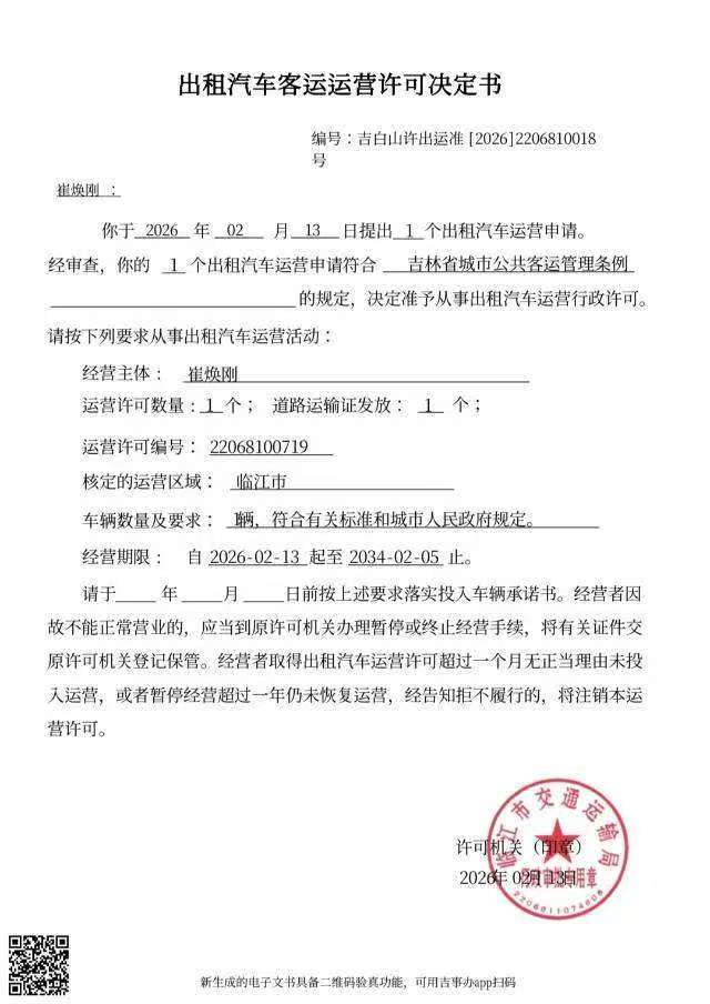 出租汽车客运运营许可决定书