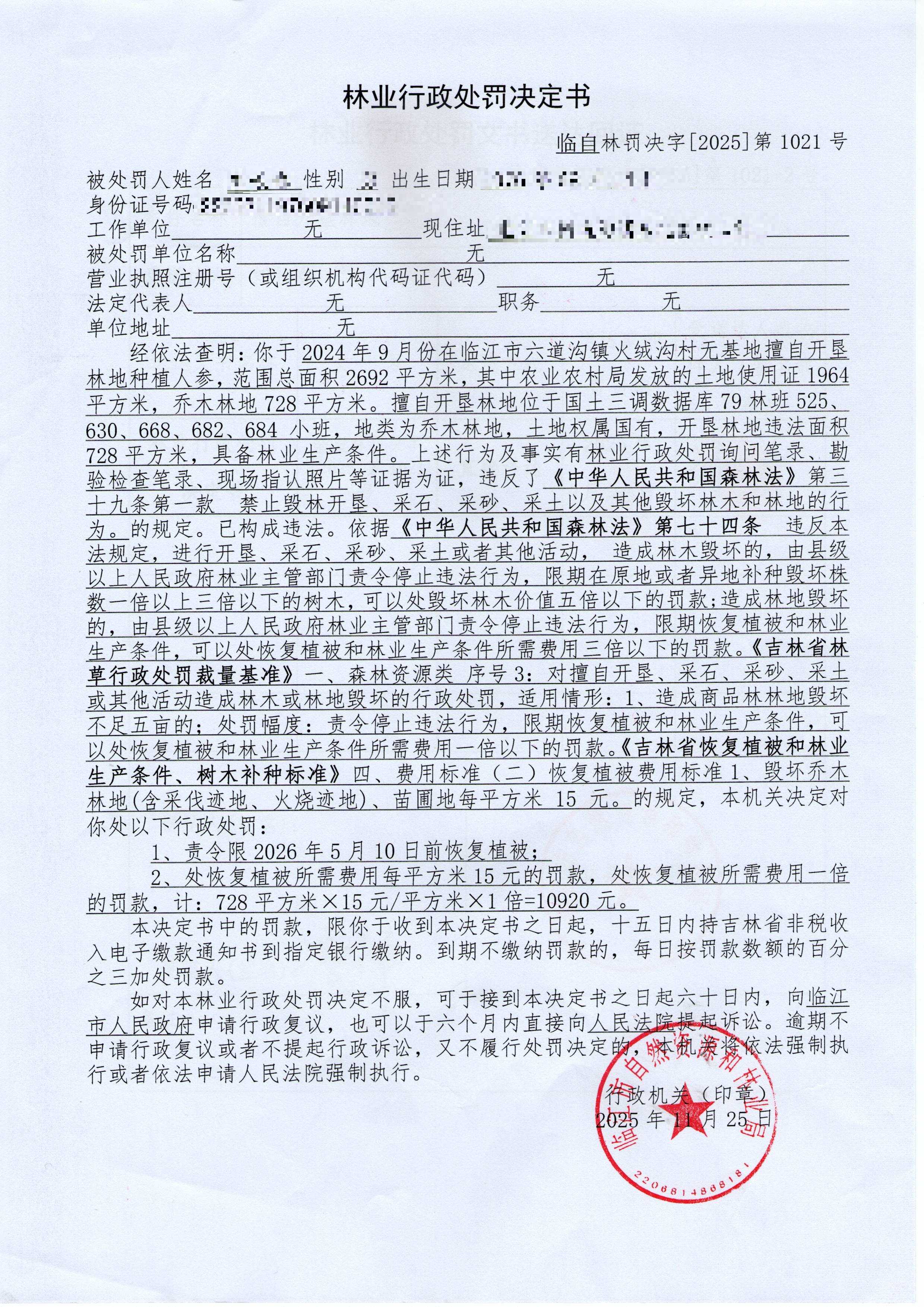 林业行政处罚决定书