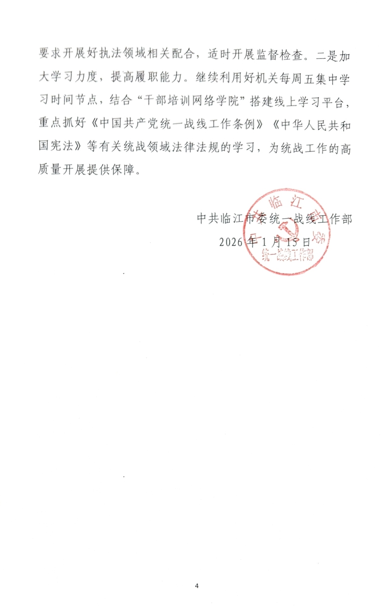 中共临江市委统一战线工作部2025年度法治政府建设工作报告